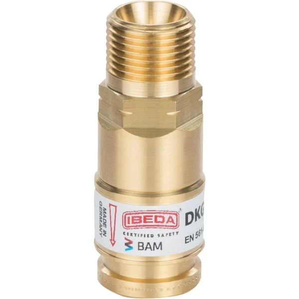 Die Schlauchkupplung DKG von IBEDA wird nach den Normen EN 561, ISO 7289 gefertigt. Sie stoppt den Gasfluss beim Auskuppeln durch eine selbsttätige Gassperre (SV) und verhindert ein versehentliches Trennen der Kupplungsverbindung. Der dazu passende codierte Kupplungsstift verhindert die Verwechslung der Gasanschlüsse. Alle metallischen Bauteile sind aus Messing. Das Push-System funktioniert ganz einfach. Einkuppeln: die Schiebehülse festhalten und den Kupplungsstift unter Druck hineinstecken, bis die Verriegelung einrastet. Auskuppeln: die Schiebehülse nach vorne schieben und den Kupplungsstift aus dem Kupplungskörper herausziehen.Art.-Nr.: 1669851