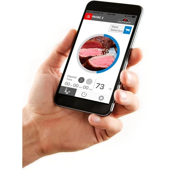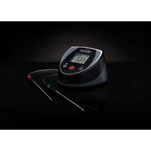 Das Bluetooth Thermometer von Napoleon misst mit 2 Temperatursonden die Kerntemperatur sowie Garraumtemperatur, so dass man stets bequem und einfach evtl. Temperaturschwankungen erkennen und ausgleichen kann. Praktischerweise können die Messwerte entweder direkt am Thermometer auf einem großzügigen Display abgelesen werden oder komfortabel auf dem Smartphone mit Hilfe der ACCU-PROBE App (Apple OS und Android) angezeigt werden. Praktische Annehmlichkeiten wie beispielsweise vorprogrammierte Temperatureinstellungen oder die Möglichkeit die Werte individuell anzupassen, lassen das Thermometer zu einem unverzichtbaren Helfer am Grill werden. Das Grillthermometer besitzt eine magnetische Halterung um es sicher am Grill fixieren zu können. Art.-Nr.: 1404752