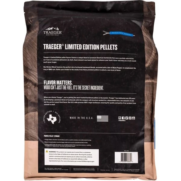 Die hochwertigen Premium-Holzpellets von Traeger bestehen zu 100% aus natürlichem Hartholz mit Lebensmittelqualität und bieten die perfekte Verbrennung für einen optimalen Holzgeschmack. In den USA hergestellt und vom Sägewerk bis zum Regal beaufsichtigt, sind die Traeger-Pellets eine saubere und gesunde Brennstoffquelle mit verschiedenen Geschmackskombinationen. Die Mischung BRISKET BLEND in limitierter Edition wurde von Traeger Köchen und Grillmeistern entworfen. Sie enthält die perfekte Kombination aus Eichen- und Pekannuss-Hölzern mit einem Hauch von schwarzem Pfeffer, um den König des Grillfleischstücks zu vollenden. Der Rauch dieser Premium-Pellets verleiht der Rinderbrust oder anderen Fleischsorten einen ganz neuen Geschmack.Art.-Nr.: 100010445